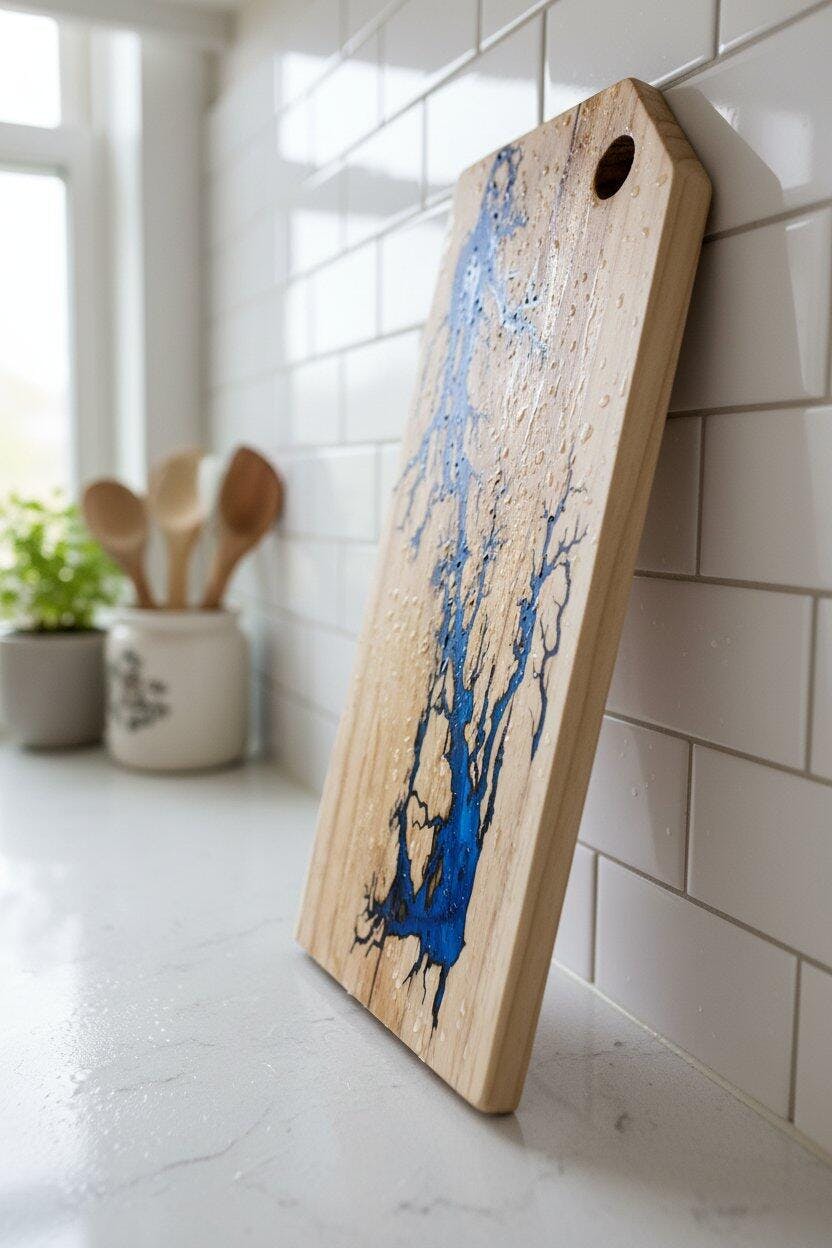 The eye-catching blue resin creates organic, flowing patterns that look like ocean waves or natural marble. These intricate designs are created through specialized pouring techniques, ensuring no two boards are exactly alike. The deep blue color provides stunning contrast against the warm wood tones, making this chopping board a beautiful addition to any kitchen countertop.